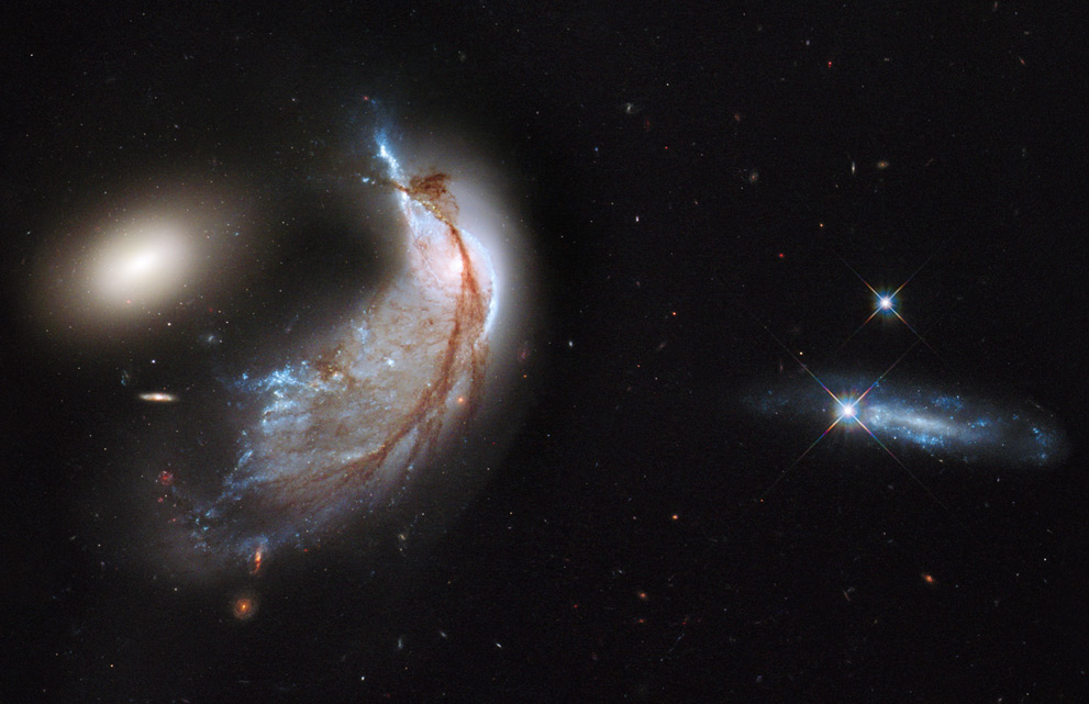 The cosmos dynamic and, in many cases, violent. This image of Arp 142 shows a collision between galaxies. The culprit: gravity.