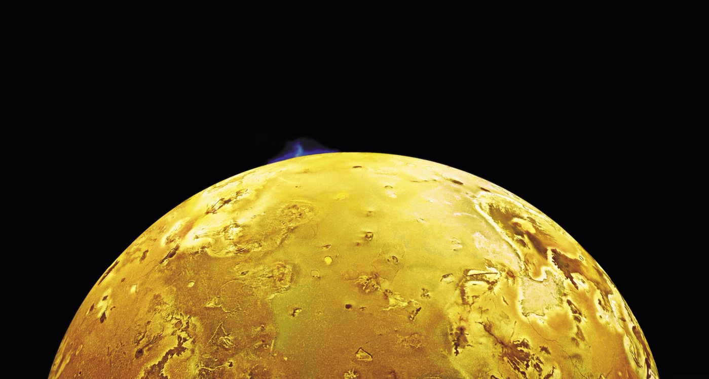 Speaking of moons, this one is Io, one of Jupiter's moons, spewing an 80 mile high plume of water ice and sulfur dioxide.